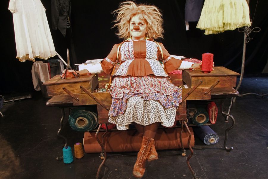 Le fil de son histoire se déroule autour d'immenses rouleaux de tissus et de mannequins de couture qui font leur ronde.